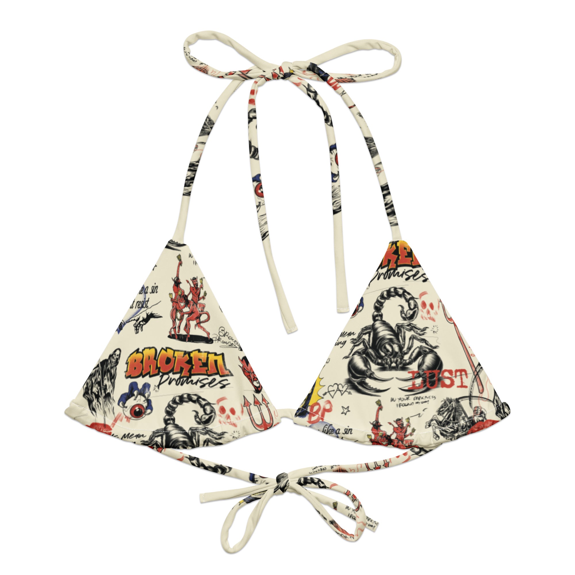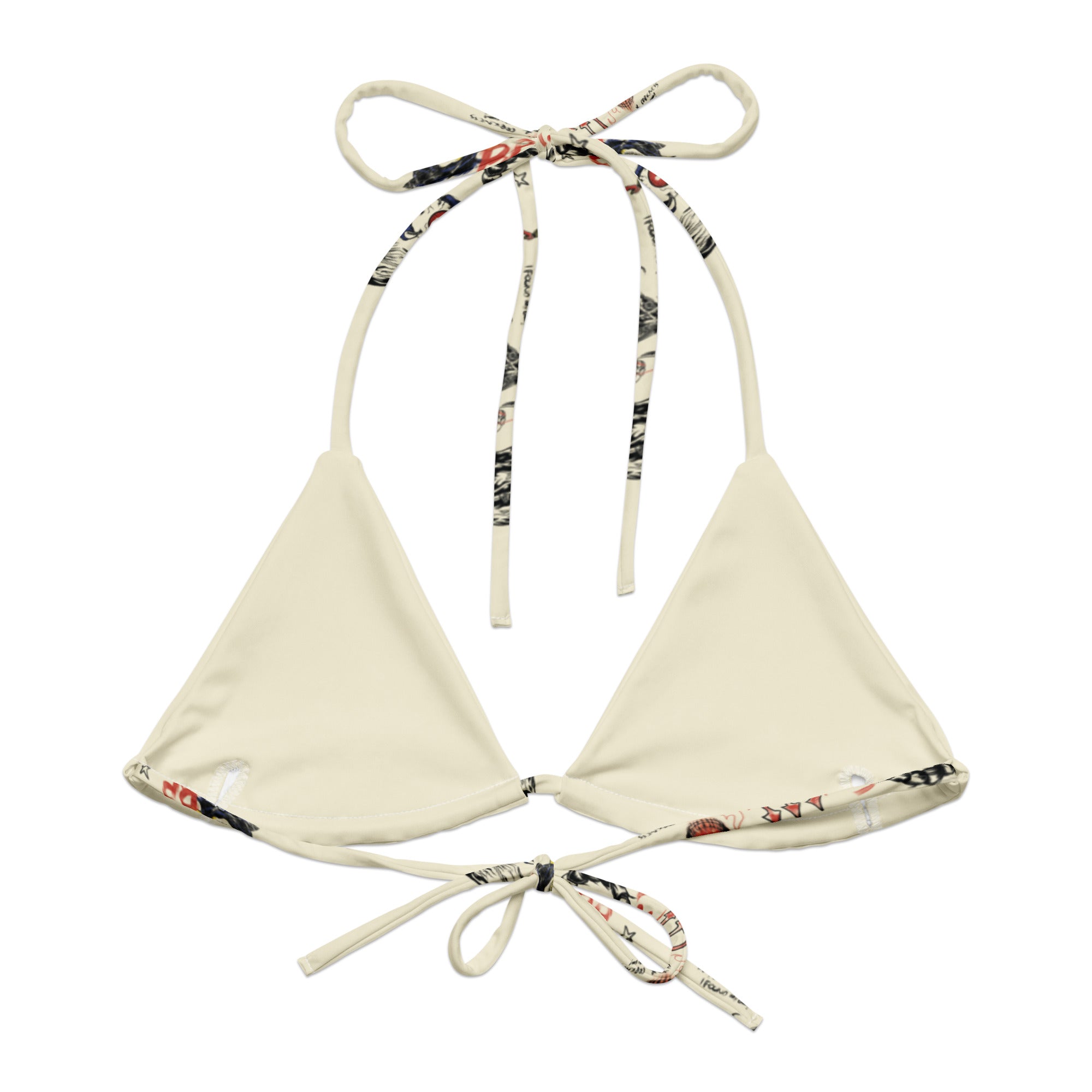 Disclaimer: To make your All-Over Print Recycled String Bikini Top last longer, thoroughly rinse it off after each use and get rid of any chlorine/salt residue.