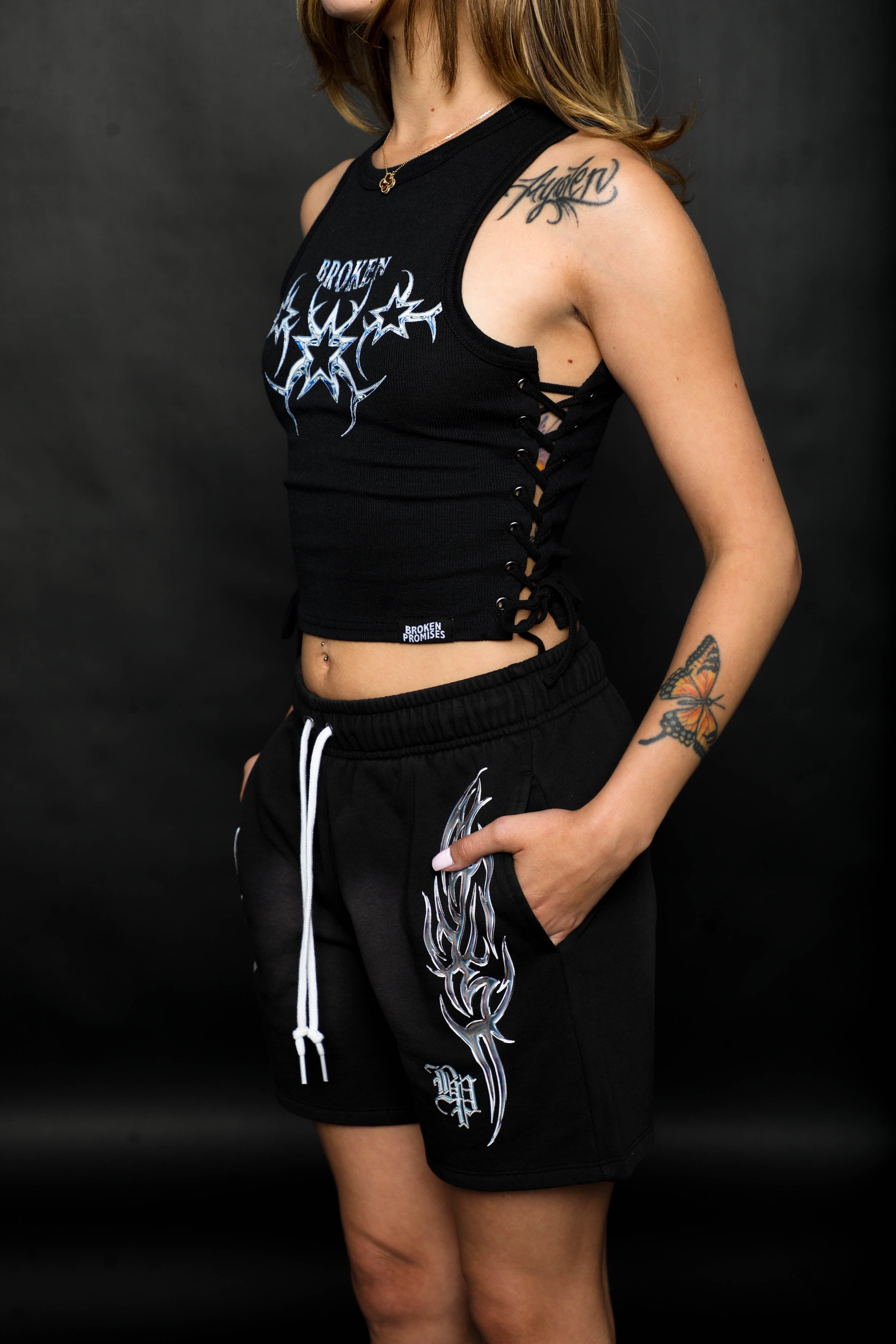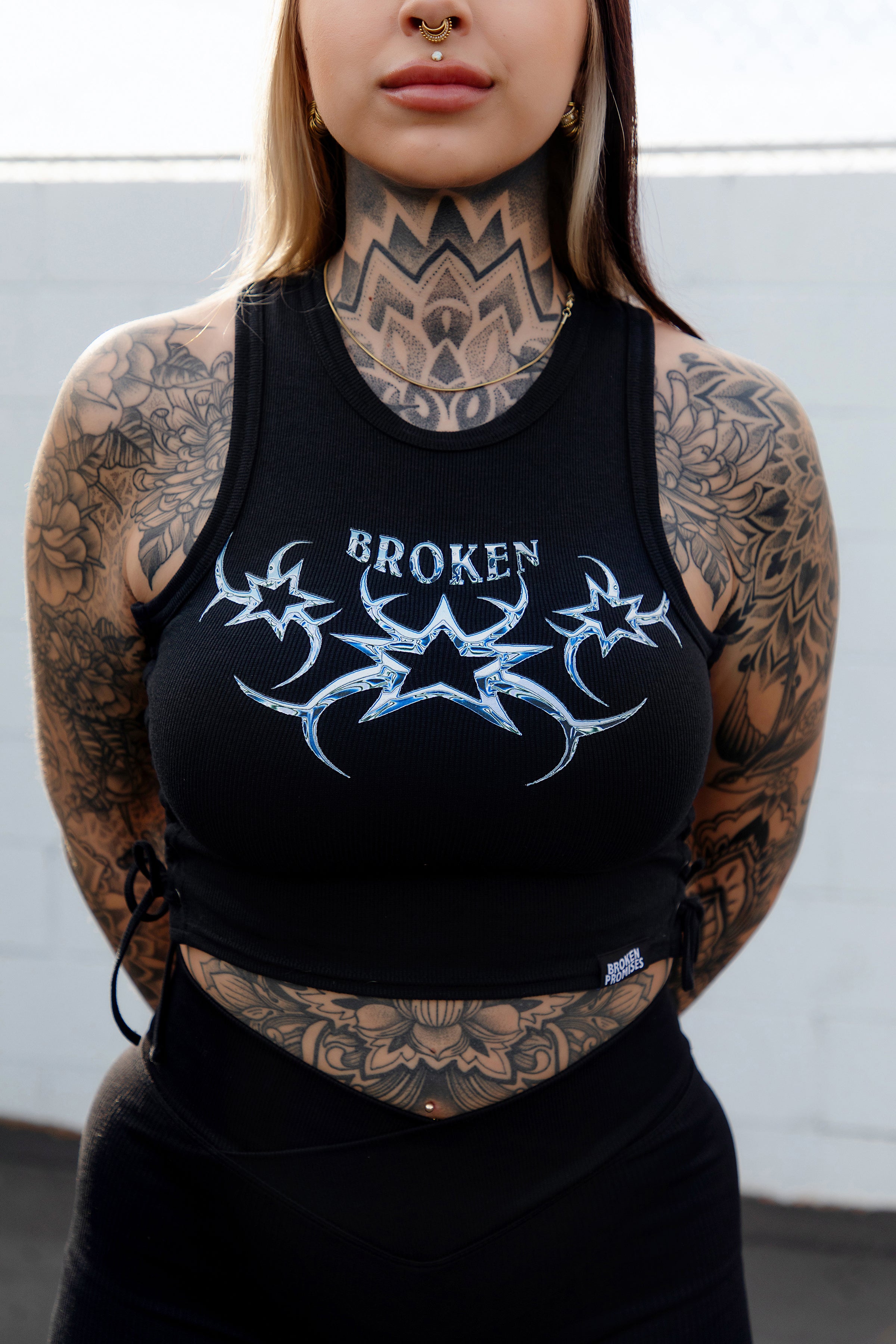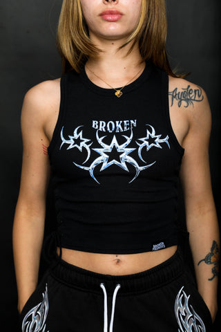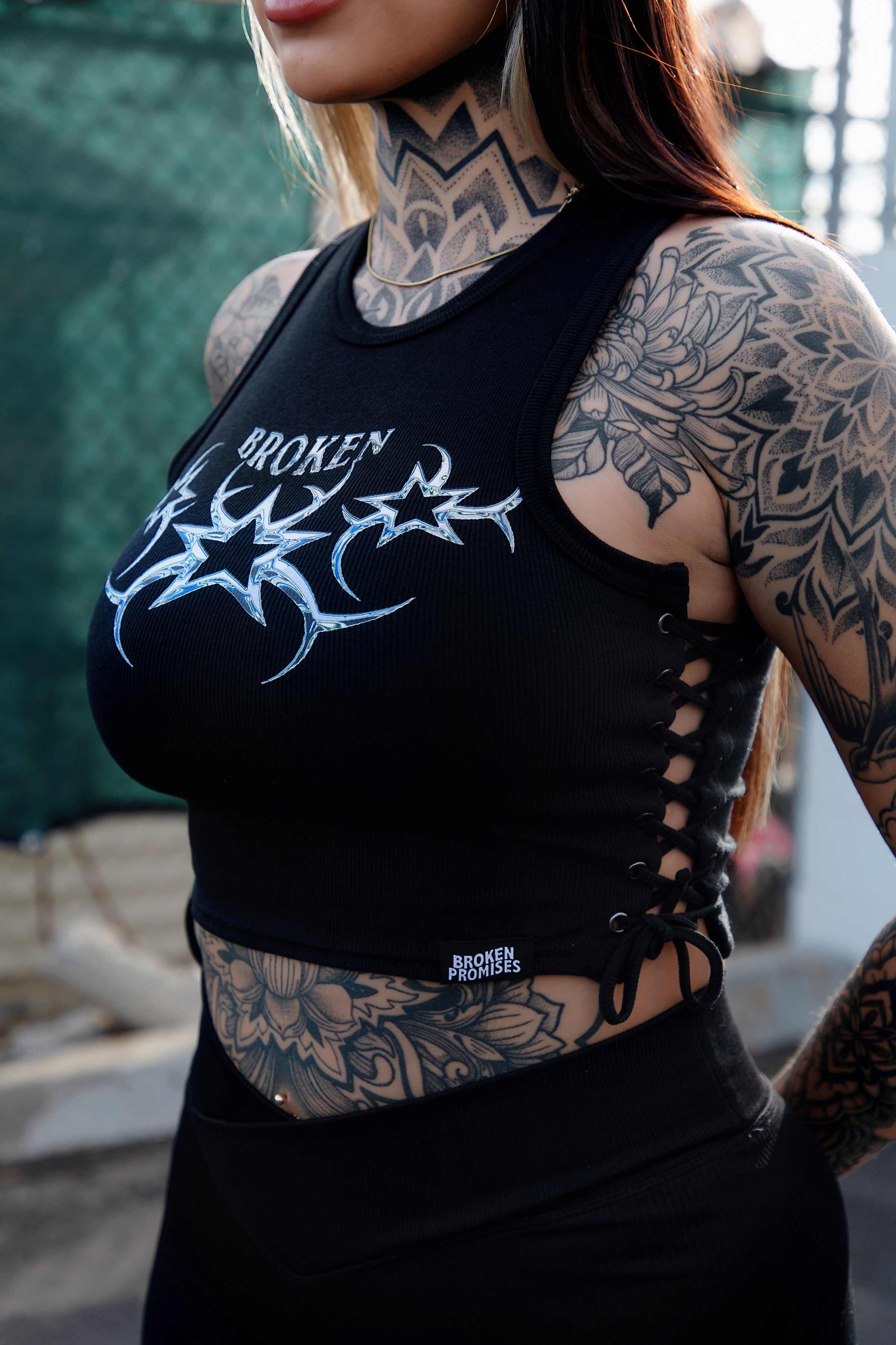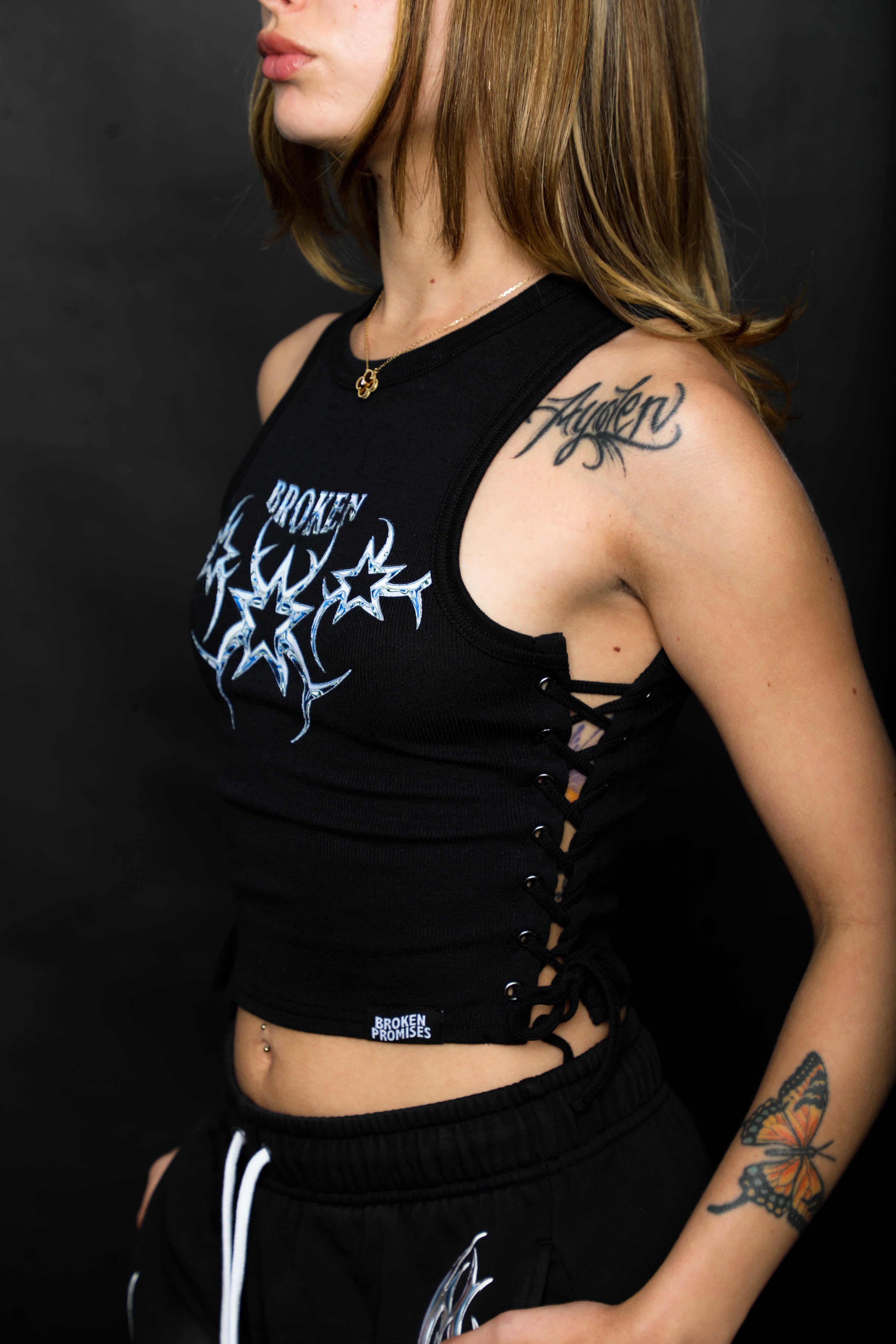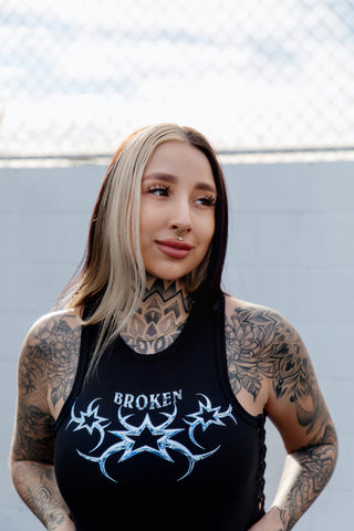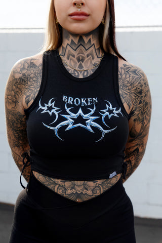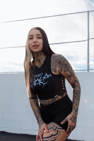 Chromium Black Lace Up Crop Tank Top from Broken Promises.Screen-printed graphic on chest.Woven brand label on bottom hem.Lace up sides.Ribbed construction.Crewneck collar.95% polyester, 5% spandex.Machine wash cold inside out, tumble dry low.