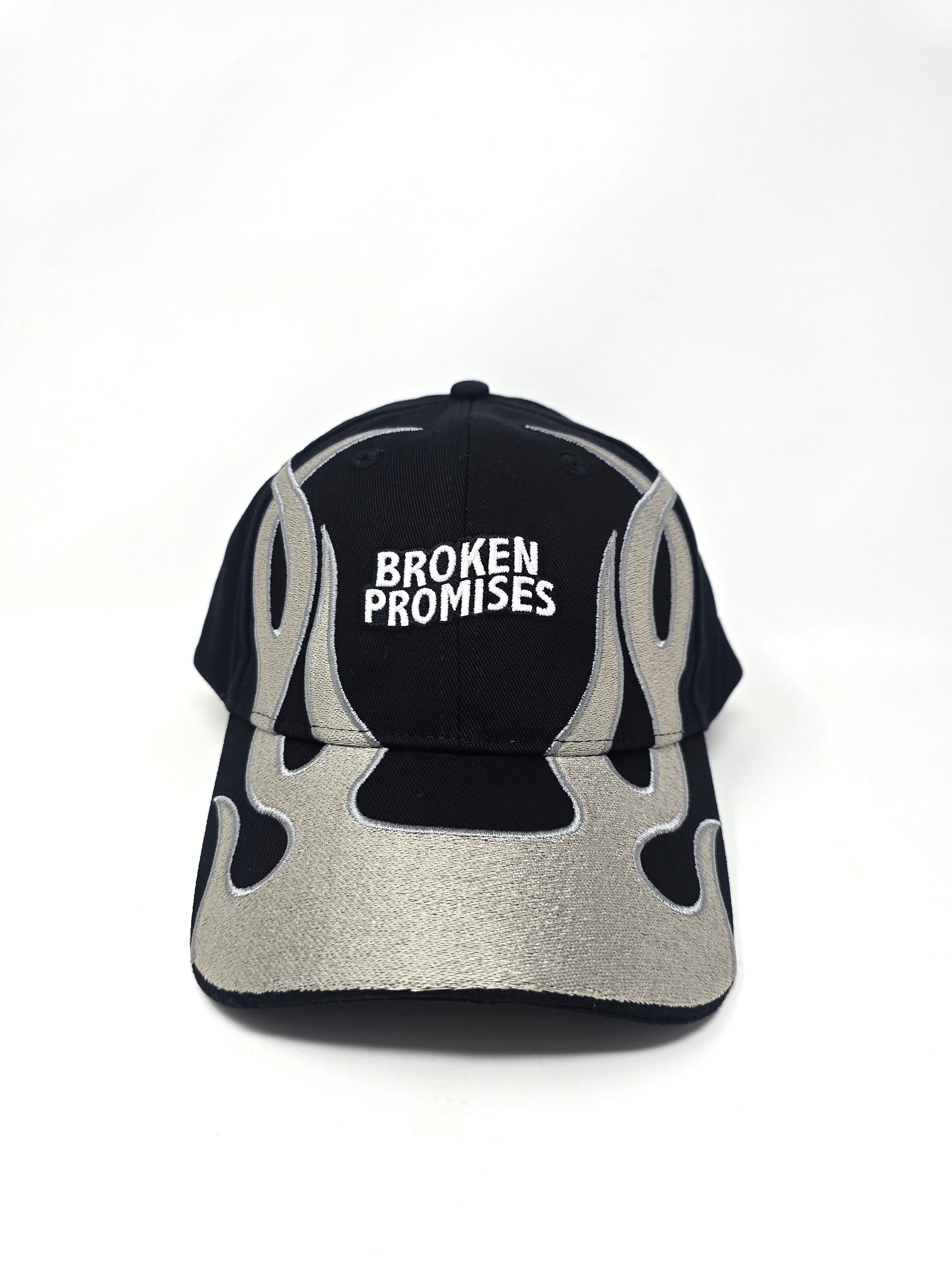 Embroidered flames on visor and crown.