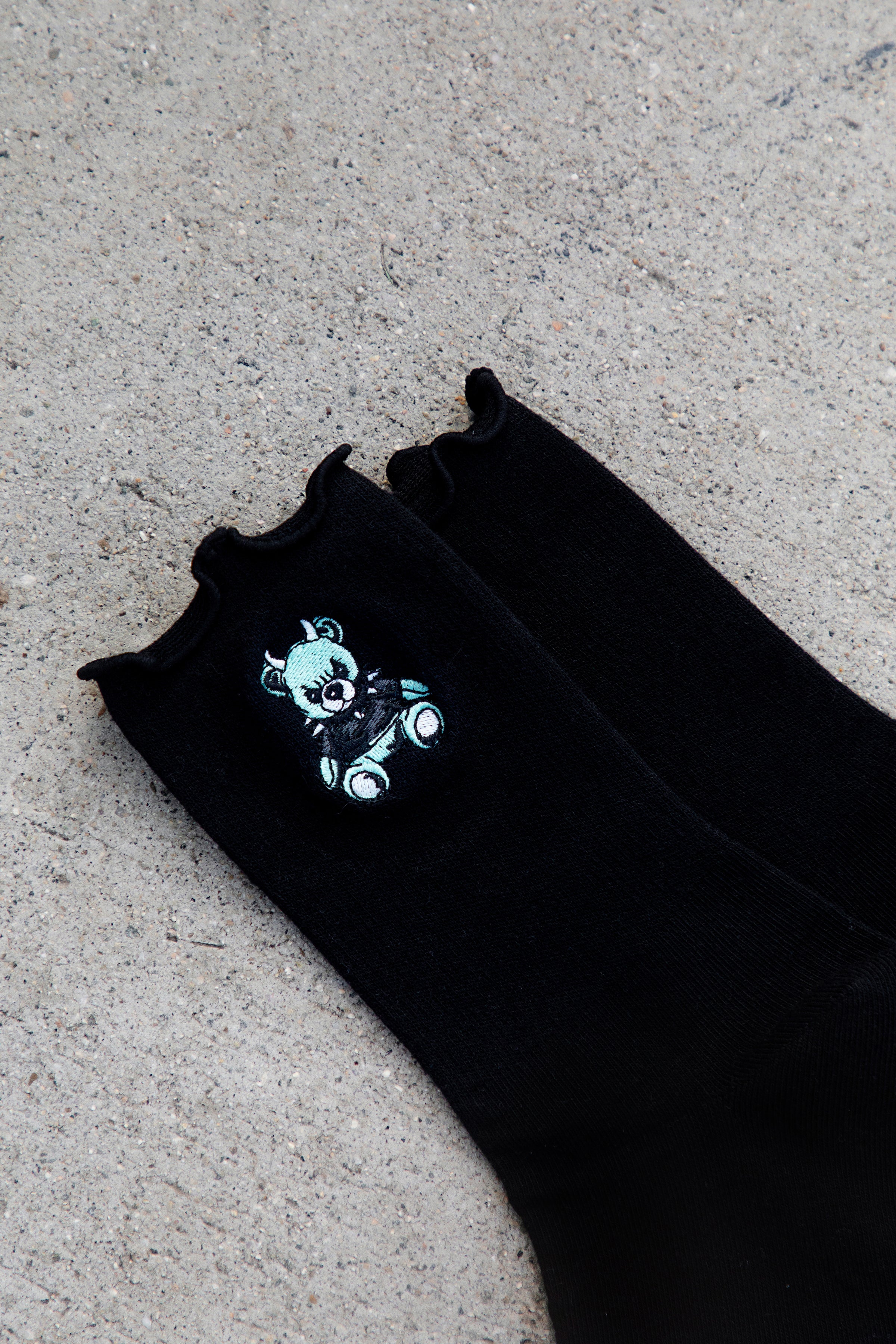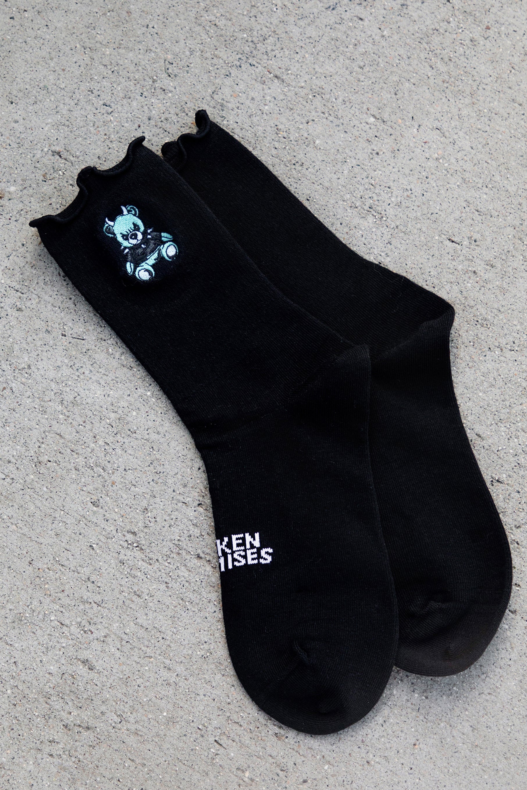 Terror Teddy Ruffle Black Half Crew Socks from Broken Promises.Ruffled trim.Embroidered graphics on upper.Jacquard-knit logo on footbed.Ribbed upper.Padded footbed.70% cotton, 25% polyester, 3% spandex, 2% nylon.Machine wash cold, tumble dry.