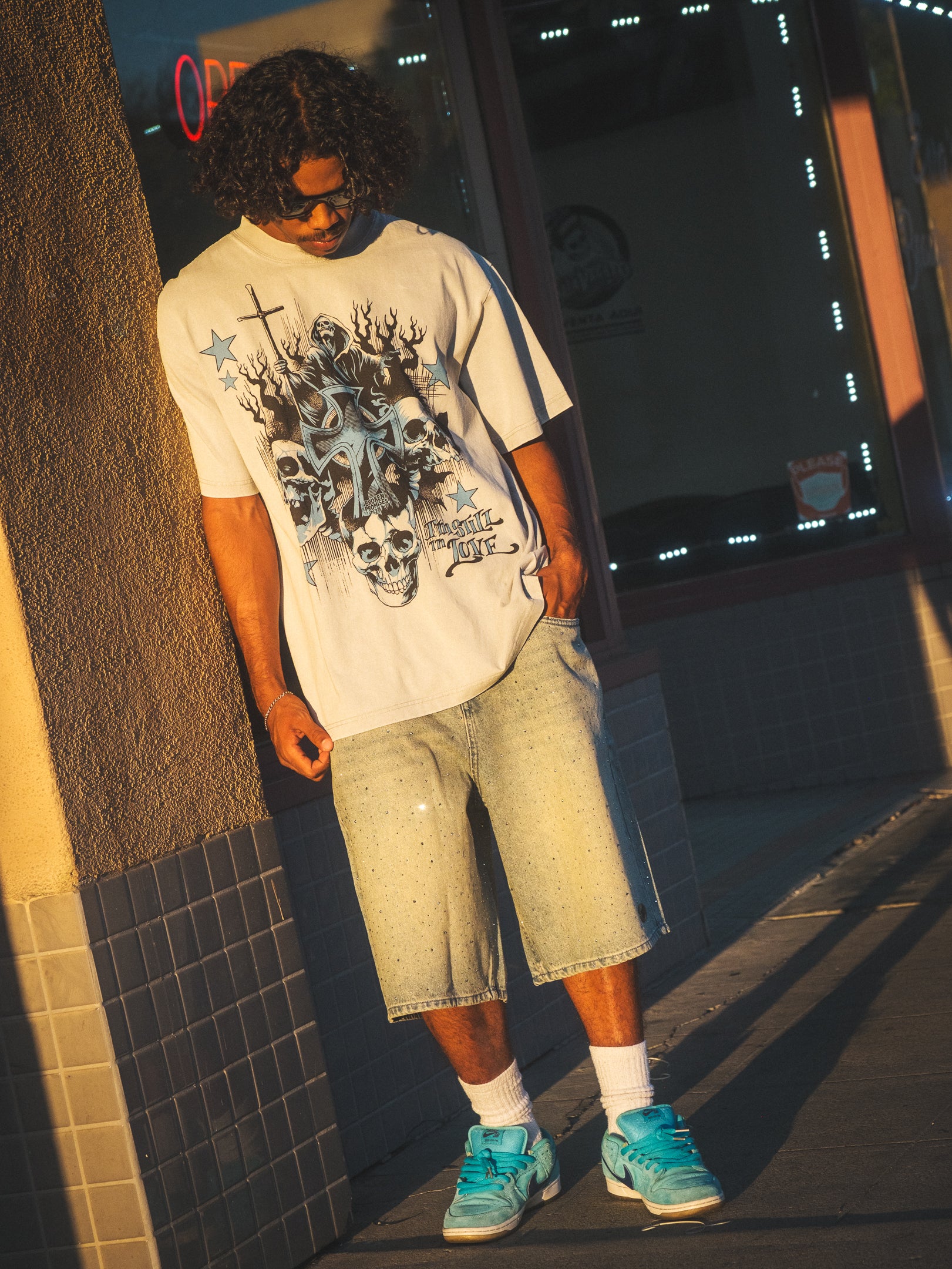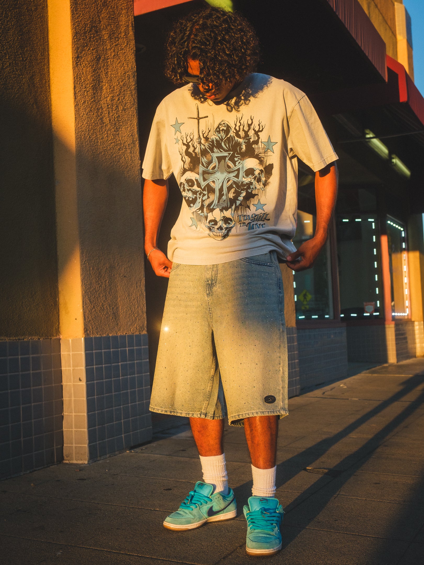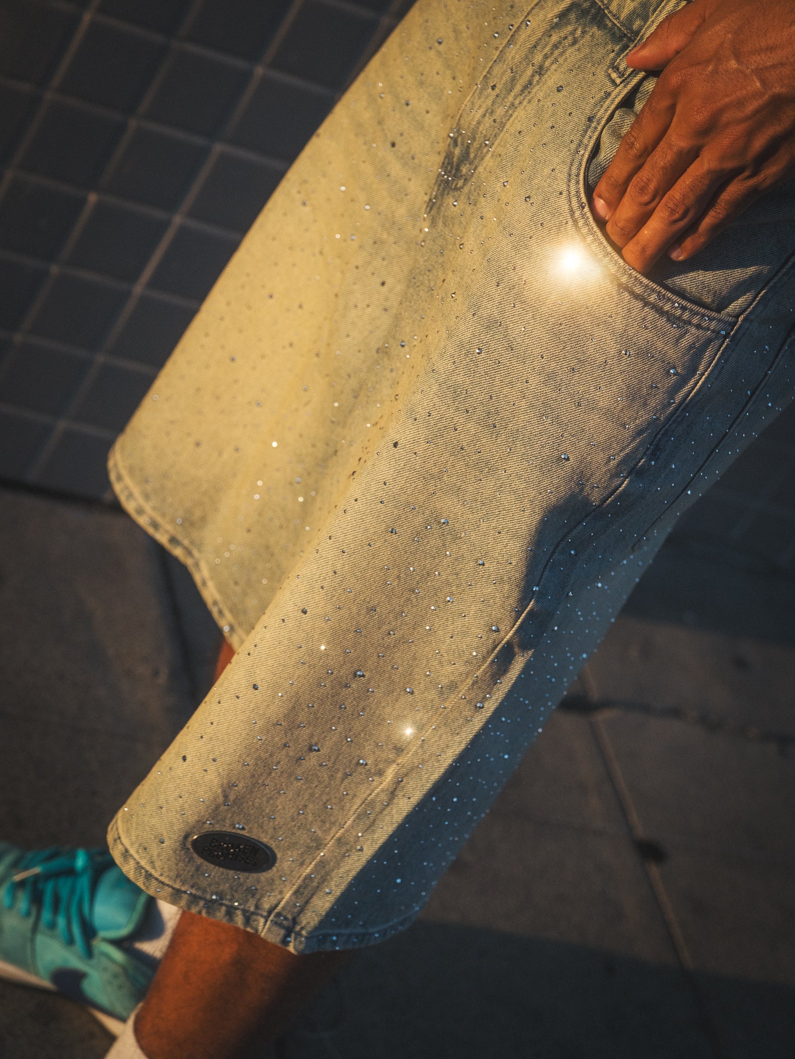 - Rhinestone detailing throughout.